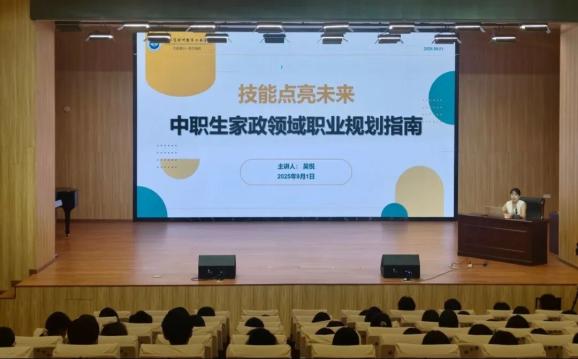 在衢州数字工业学校的小报告厅,主讲教师吴悦以“技能点亮未来——中职生家政领域职业规划指南”为主题,为同学们精心带来了一场内容丰富、实用性强的知识盛宴。她深入浅出地分析了家政行业现状、中职生优势、职业规划路径等内容,并巧妙结合真实案例,讲解了母婴护理技能、早教技能、营养搭配等方面的知识,让同学们深刻感受了这一领域的新趋势与新机遇。