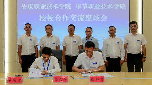 次日,两校举行合作协议签署仪式。毕明生与毕节职业技术学院党委书记赵军、校长桂祥友进行了深入交流。两校校长签署了框架合作协议。毕节职业技术学院是贵州省第一轮省级“双高计划”建设单位,学校先后被授予“国家级高技能人才培训基地”“全国公共机构效能领跑者”“全省脱贫攻坚先进党组织”“东西部协作示范校”等荣誉称号,与安庆职业技术学院在人才培养、专业建设、师资交流、科研合作、社会服务等方面有深度合作空间。