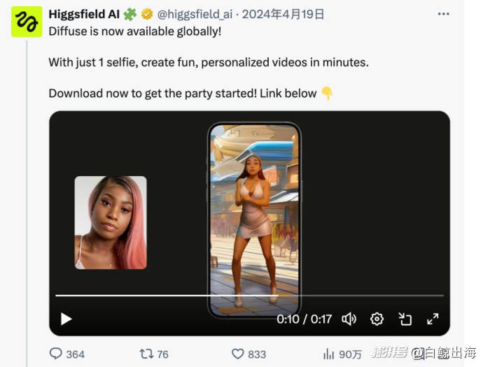 Higgsfield 背后的公司,于 2023 年创立。2024 年 4 月,团队第一款移动端产品 Diffuse 全球上线。看当时的官方推文,这是一款典型的 toC 娱乐应用,用户上传一张自拍,把人像插入到某一个场景里,就可以生成一段创意视频。