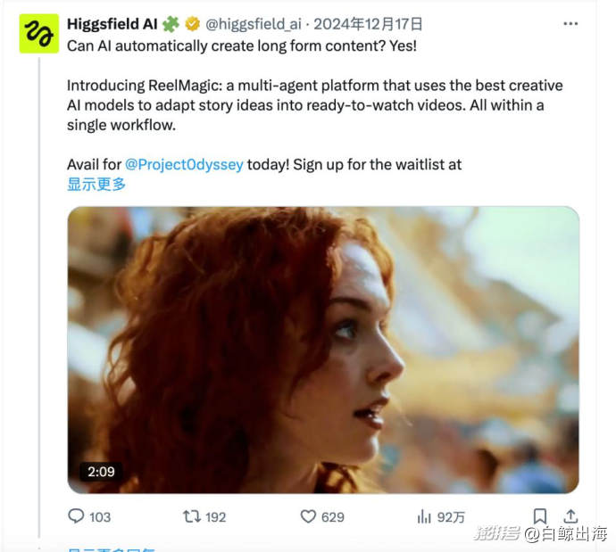 2024 年年底 Higgsfield 官宣推出 ReelMagic | 图片来源:官X