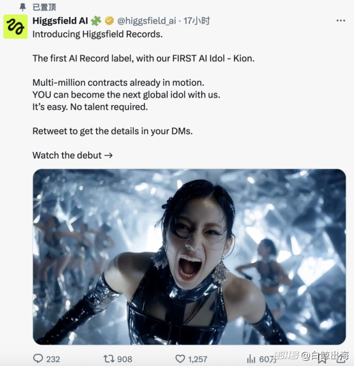 Higgsfield 在 8 月底推出了自己的第一个 AIol,Kion| 图片来源:官X