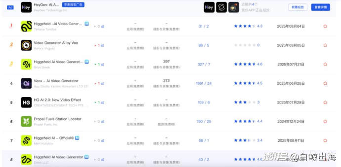 而时间来到 2025 年,结果不言而喻,他再次公开分享时,直言 AI 技术与主要靠梗来驱动的病毒短视频并不适配,AI 在里面没有多少发挥空间。而新上线的 Higgsfield AI 至今还没有上线移动端,倒是有 HeyGen 和 Kling 这样的热门产品就 Higgsfield 的关键词投放 ASA,应用商店里也不少“蹭”的产品。