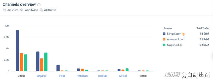 从整体流量来源来看,作为一个上线几个月的新产品,Higgsfield 呈现出了很不错的品牌认知,其中又以自然搜索与社交流量明显偏强,凭借只有可灵 AI 一半左右的月访问量,Higgsfield 拿下了与后者差不多量级的自然搜索量、和更多的社交流量,尤其在 X 上的表现更好。