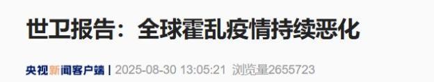 报告显示,2025年1月1日至8月17日期间,全球31个国家累计报告超过40.9万例霍乱/急性水样腹泻病例,包括4738例死亡病例,其中6个国家病死率超过1%。