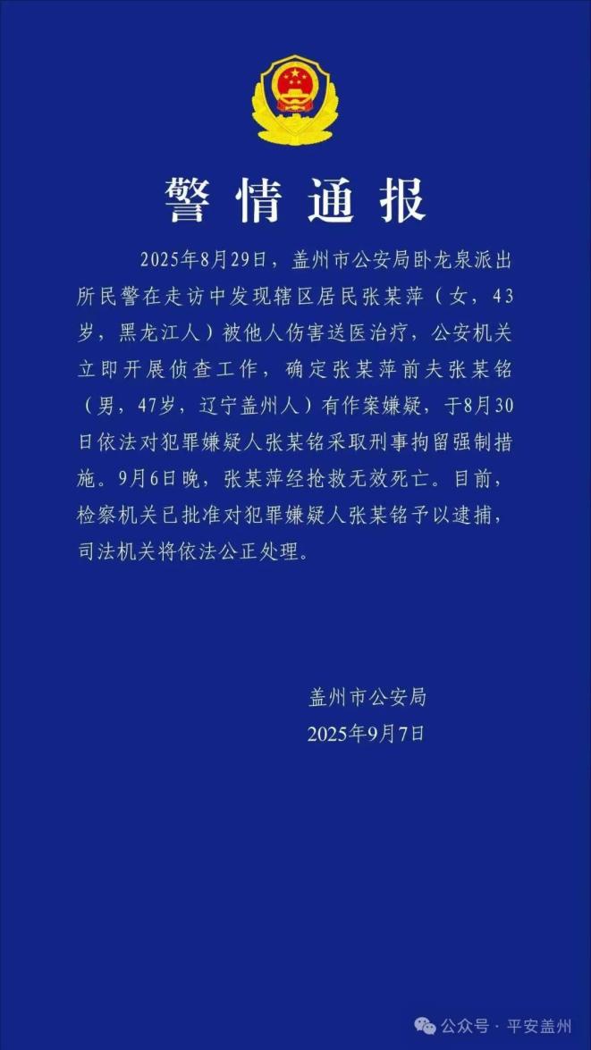 2025年8月29日,盖州市公安局卧龙泉派出所民警在走访中发现辖区居民张某萍(女,43岁,黑龙江人)被他人伤害送医治疗,公安机关立即开展侦查工作,确定张某萍前夫张某铭(男,47岁,辽宁盖州人)有作案嫌疑,于8月30日依法对犯罪嫌疑人张某铭采取刑事拘留强制措施。9月6日晚,张某萍经抢救无效死亡。