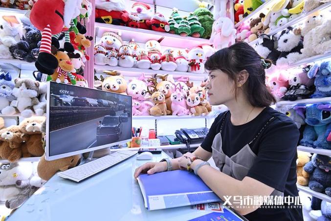 市场经营户正在收看大会直播当日上午,义乌国际商贸城一区内,不少经营户纷纷打开电视或电脑,专注收看大会直播。各个通道中回荡着直播的声音,大家一边紧盯屏幕,一边不时低声交流。当受阅方队整齐划一地走过天安门广场,战机编队呼啸而过,许多人停下手中的工作,凝神注视,有人举起手机,记录下这些激动人心的瞬间。