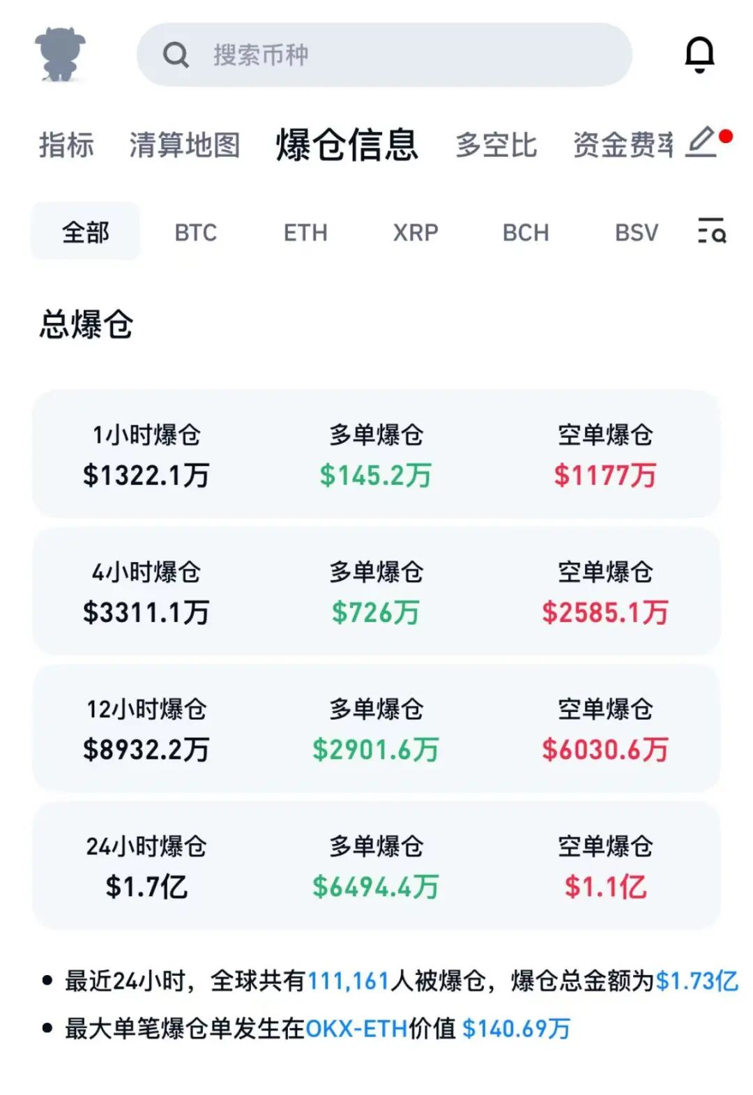 Coinglass数据显示,过去24小时加密货币市场共有超11万人被爆仓,爆仓总金额为1.73亿美元。
