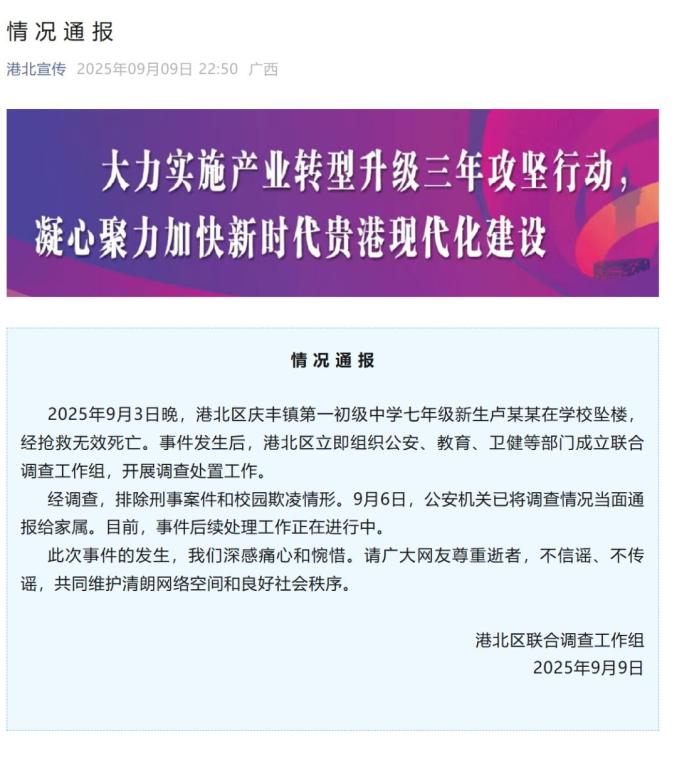 2025年9月3日晚,港北区庆丰镇第一初级中学七年级新生卢某某在学校坠楼,经抢救无效死亡。事件发生后,港北区立即组织公安、教育、卫健等部门成立联合调查工作组,开展调查处置工作。
