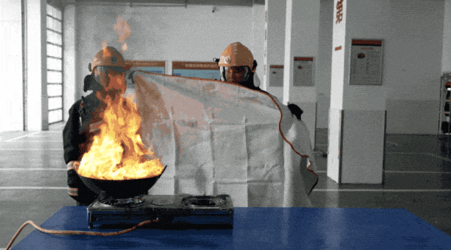 将灭火毯盖到油锅上,注意按压四周。此外,要从靠近身体的一侧向外铺开灭火毯,让灭火毯首先将人的身体与火焰进行隔离,避免引火烧身。⚠️若火势依旧不可控,请立即转移至安全处拨打119报警。