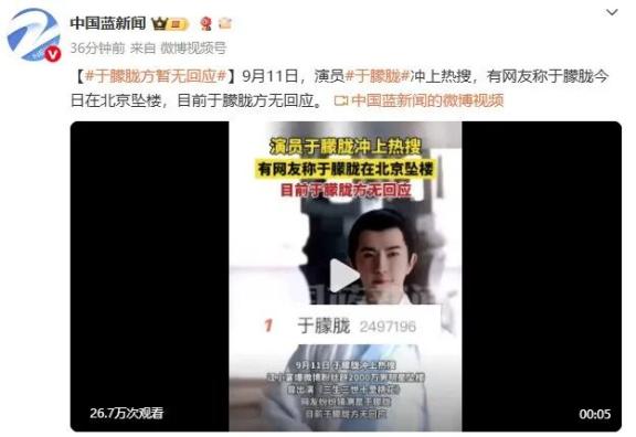 据中国蓝新闻,9月11日,演员于朦胧冲上热搜,有网友称于朦胧今日在北京坠楼,目前于朦胧方无回应。