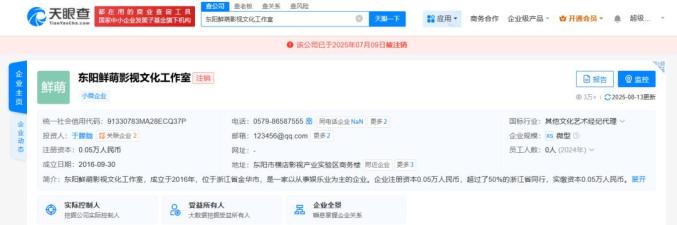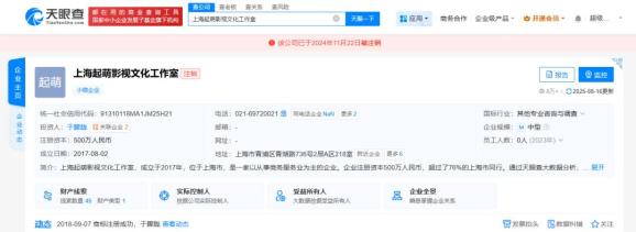 天眼查任职信息显示,于朦胧名下关联2家工作室,分别为上海起萌影视文化工作室、东阳鲜萌影视文化工作室,均为注销状态。其中,上海起萌影视文化工作室成立于2017年8月,于2024年11月注销,出资额500万人民币,为于朦胧个人独资企业。知识产权信息显示,该工作室已成功注册多枚“于朦胧”商标。此外,东阳鲜萌影视文化工作室成立于2016年9月,于2025年7月注销,出资额0.05万人民币,为于朦胧个人独资企业。