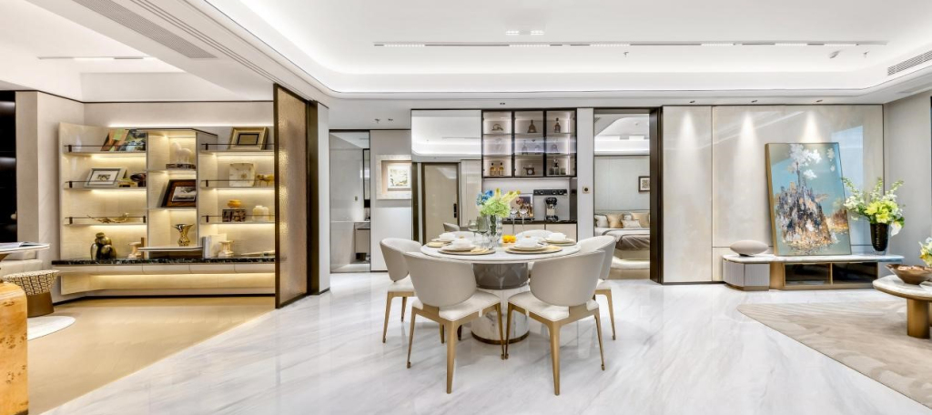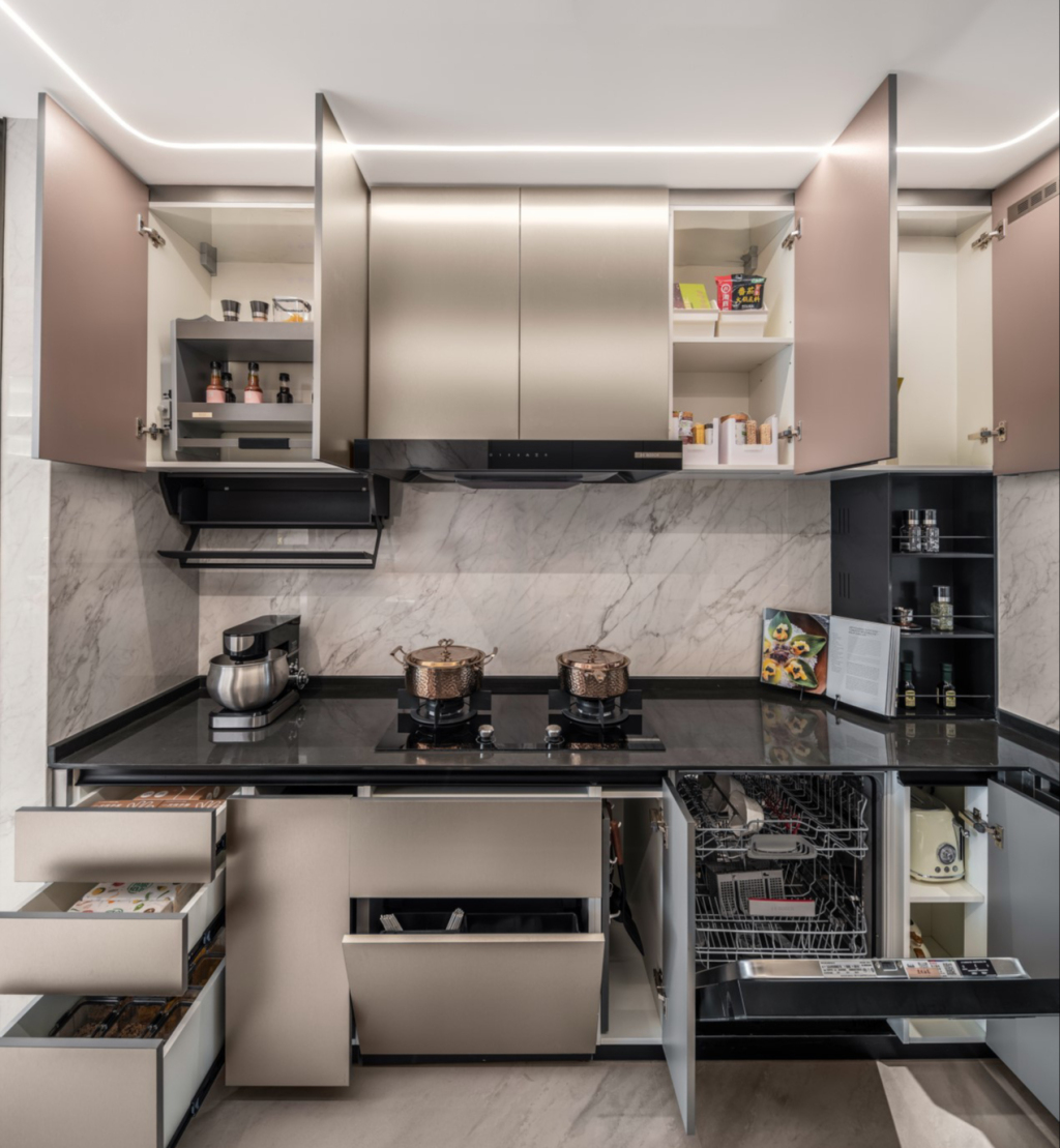 全屋集成海量收纳系统,配备多功能餐边柜、定制橱柜与双面镜柜等,拓展相当于一间卧室的储物容量,容纳生活美好想象,让家越住越从容。