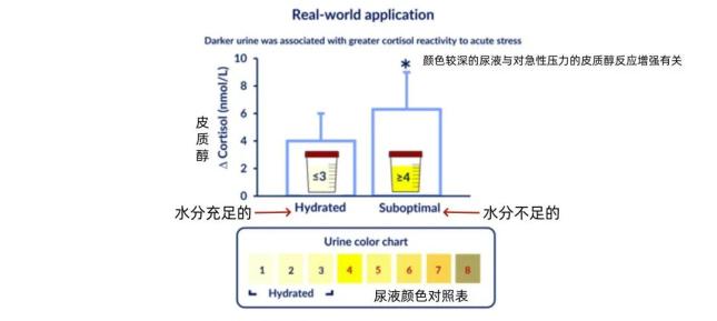 此外,研究还发现,喝水太少(例如晨尿颜色较深)与皮质醇对急性压力的反应性更强相关。注意,并不是我们感到口渴时才需要喝水,我们可以通过尿液颜色进行简单判断(如下图)。换句话说,尿液颜色越浓、越深的人,在进入面对较大压力时,压力激素反应越强烈。