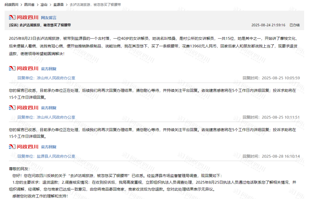 比如,针对上述游客投诉的8月23日在泸沽湖旅游时,在名叫格桑的女讲解员“忽悠”下花13960元买了一条银腰带,盐源县人民政府办公室在8月28日回复称,在收到投诉后,盐源县市场监督管理局立即组织执法人员调查处理,2025年8月25日执法人员通过电话联系了解相关情况,并组织调解,经调解,消费者与商家已达成一致意见,由消费者将商品寄回商家,商家收货后退款。