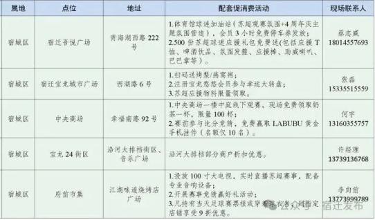 ✅宿迁吾悦广场设置观赛专区,现场500份“苏超”球迷应援礼包免费送(应援T恤、啤酒饮品、氛围发箍、应援棒、助威喇叭等);当天发放会员3小时免费停车券;✅宿迁宝龙城市广场推出扫码赠饮品、会员抽奖及应援物料发放等福利活动;