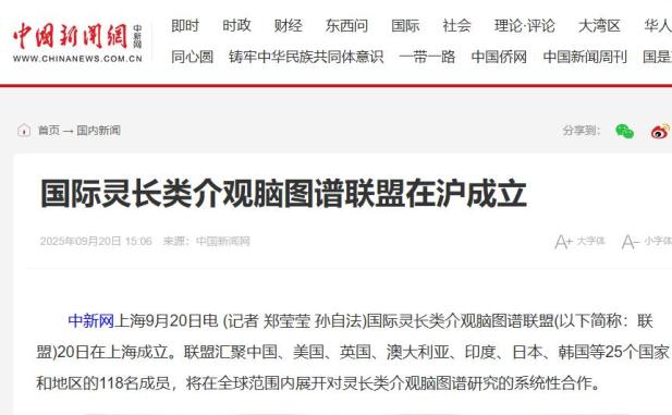 国际灵长类介观脑图谱联盟(以下简称:联盟)20日在上海成立。联盟汇聚中国、美国、英国、澳大利亚、印度、日本、韩国等25个国家和地区的118名成员,将在全球范围内展开对灵长类介观脑图谱研究的系统性合作。https://www.chinanews.com.cn/gn/2025/09-20/10485895.shtml