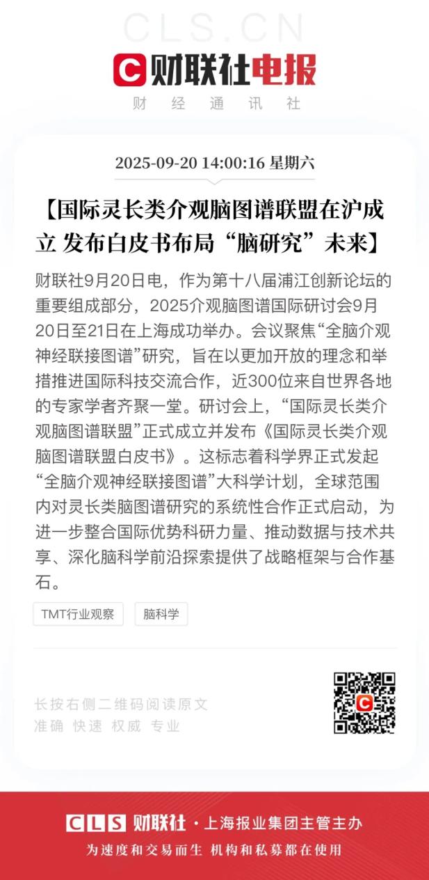 “通过整合全球顶尖科研力量、关键技术与设施等资源,该计划有望系统揭示灵长类大脑的结构与功能奥秘,推动脑疾病机制研究、类脑智能发展与神经医学应用进入新阶段,为构建人类命运共同体提供坚实的科学支撑。”9月20日,作为第十八届浦江创新论坛的重要组成部分,2025介观脑图谱国际研讨会在上海开幕。会上宣布国际灵长类介观脑图谱联盟发起成立,并举行了联盟核心成员单位的签约仪式,同时发布《国际灵长类介观脑图谱联盟白皮书》。https://www.stdaily.com/web/gdxw/2025-09/20/content_404290.html#