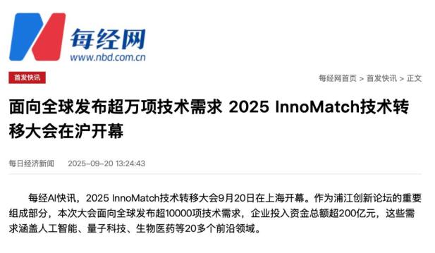 2025 InnoMatch技术转移大会9月20日在上海开幕。作为浦江创新论坛的重要组成部分,本次大会面向全球发布超10000项技术需求,企业投入资金总额超200亿元,这些需求涵盖人工智能、量子科技、生物医药等20多个前沿领域。http://www.nbd.com.cn/articles/2025-09-20/4068354.html