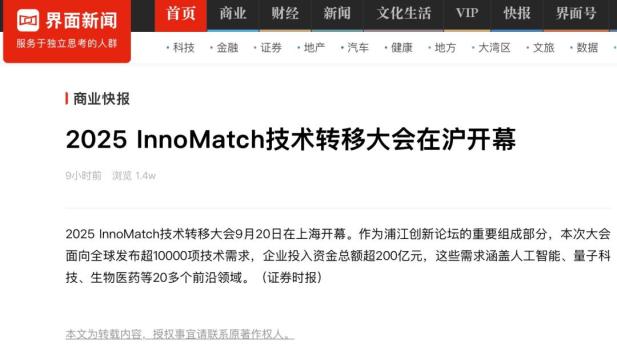 《面向全球发布超万项技术需求 2025 InnoMatch技术转移大会在沪开幕》