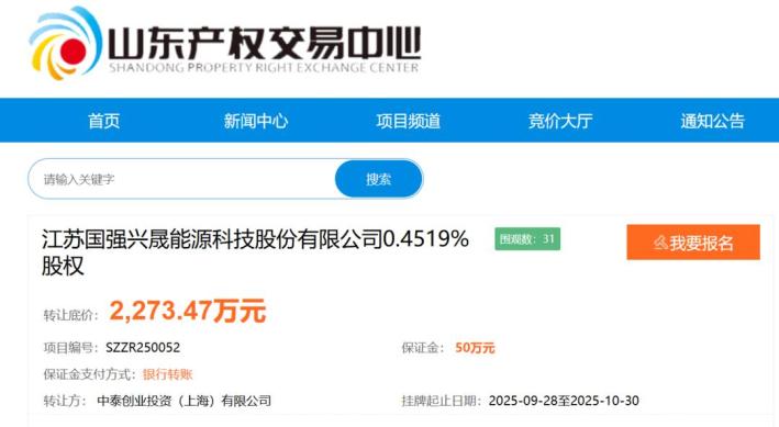 9月28日,江苏国强兴晟能源科技股份有限公司(下称“国强兴晟”)0.4519%股权在山东省产权交易中心挂牌转让,转让底价2273.47万元,转让方为中泰创业投资(上海)有限公司(下称“中泰创投”)。