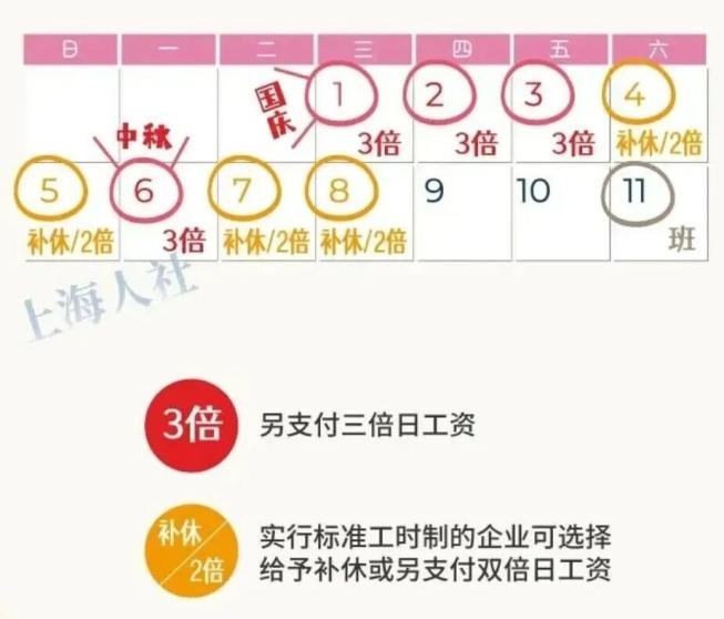 国庆中秋假期中,10月1日、2日、3日、6日属于法定节假日。10月4日、5日、7日、8日,属于放假期间的休息日。加班费这样算↓(戳我了解更多>>>)