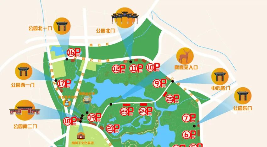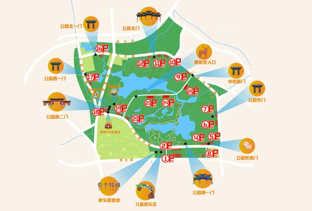 ·驾车:公园南环路、公园北环路,选择9、10、11、12、16、17、18、19、21号停车场,中心路内23、24、25号停车场在10月1日至8日临时开放。