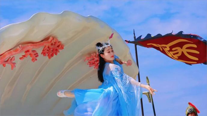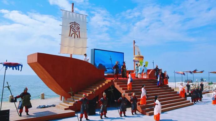 演出中,“千帆竞发”“祭天开海”等场景气势磅礴,营造出极具冲击力的沉浸体验。观众席地临海,看演员从身边走过,仿佛穿越回那个风起云涌的大秦时代。
