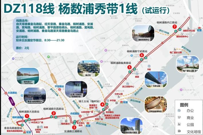 “杨数浦秀带1线”DZ118线定制公交线路以天章路秦皇岛路秦皇岛码头公交枢纽为起点,途经渔人码头、绿之丘等15个站点,形成环线运营,车辆往返用时约40分钟左右。