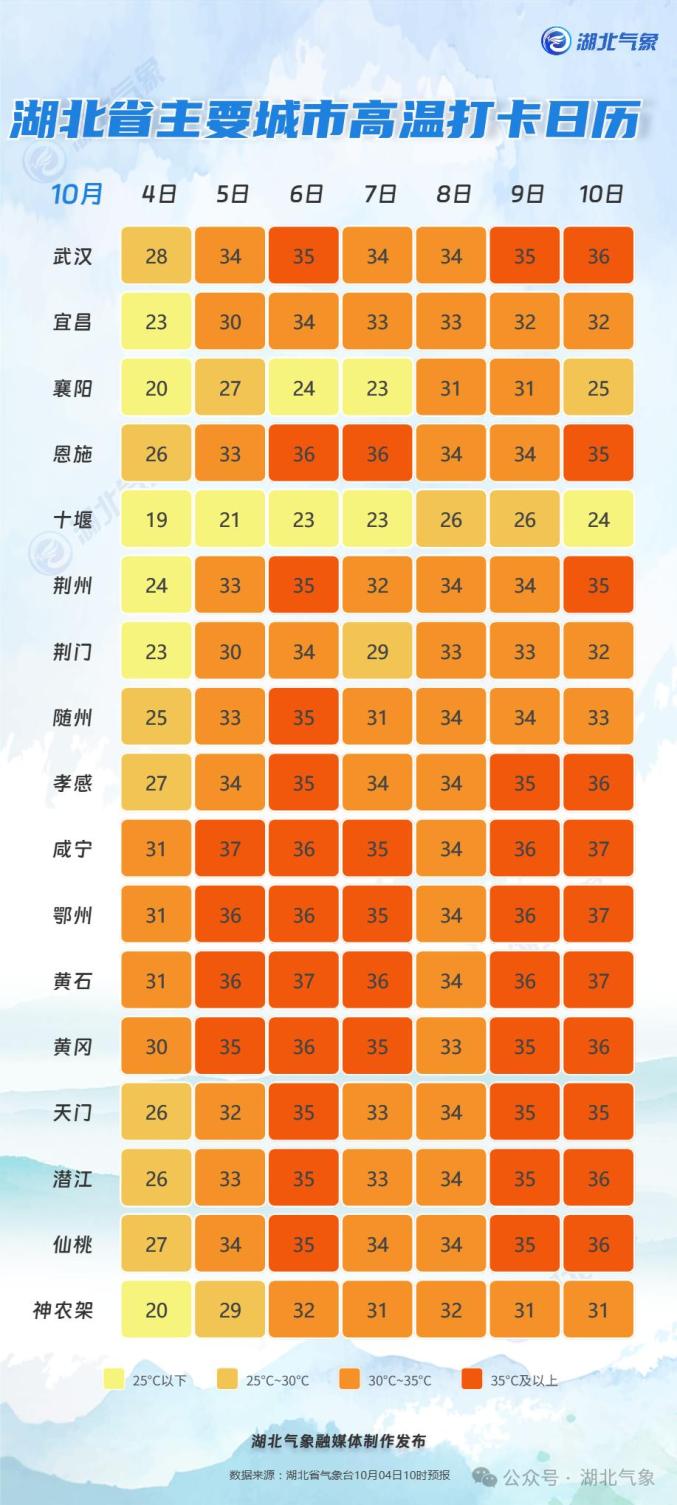 10月6日08时-7日08时,鄂西北多云有阵雨;其他地区多云到晴天,局地有阵雨或雷阵雨。最高气温鄂西北24~32℃、其他地区33~37℃,最低气温19~25℃,偏东风转偏北风2到3级。