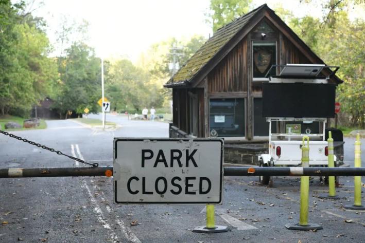 10月3日,在美国弗吉尼亚州费尔法克斯,受联邦政府“停摆”影响,通往大瀑布公园游客中心的道路关闭。李睿摄(新华社)