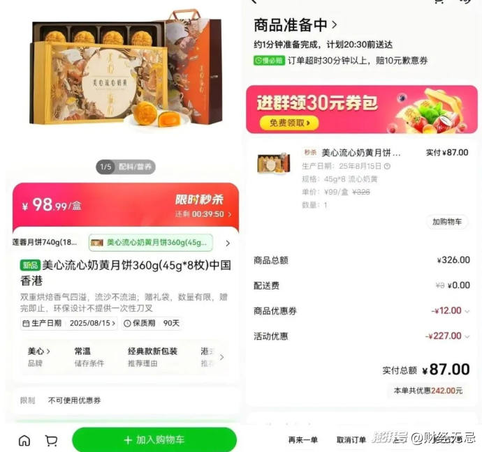 为了买得更值,李欣提前两个月就做起攻略,除了在线下和各大电商平台比价外,今年8天的国庆假期和即时零售平台的便利,让她可以随机“捡漏”好价月饼。临近中秋前两天,她就在发现家附近的永辉超市、小象超市月饼开启了降价,甚至不到100元就能拿下美心。