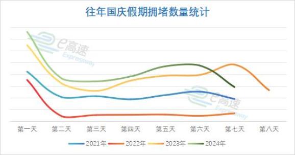 返程高峰时段据2021至2024年数据显示,国庆假期第一天道路缓行的情况比较明显,其次是假期结束前的倒数第二天,基本与人们选择启程和提前返程时间节点有关。