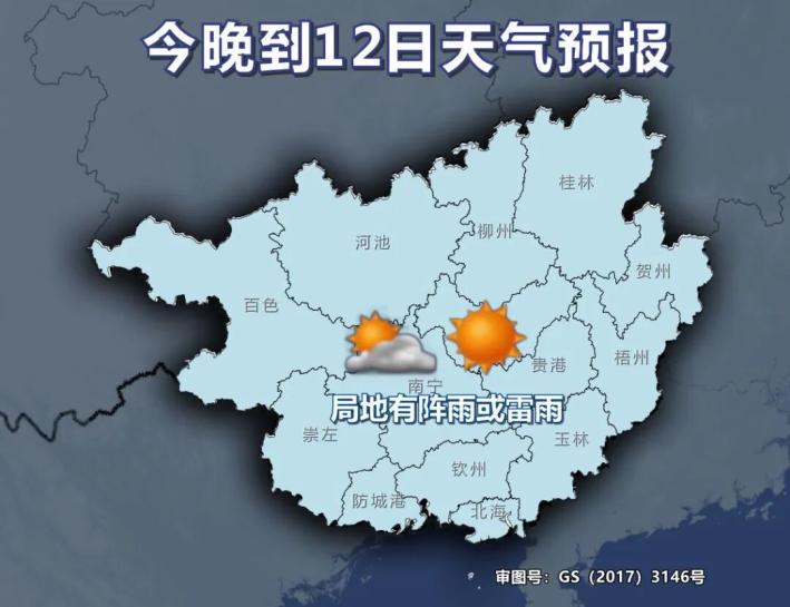 今天晚上到明天白天,全区多云到晴,其中桂林、柳州、百色等市局地有阵雨或雷雨。森林火险气象等级:全区3级,较高火险。