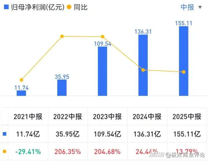 但2022年—2025年上半年,比亚迪净利润增长率连年下跌,分别为206.35%、204.68%、24.44%、13.79%。其竞争对手宁德时代虽然2022年—2024年净利润增长率也是连年下跌的,但2025年上半年其净利润增长率从上年同期的10.37%增至33.33%;国轩高科则从29.69%增至35.22%。