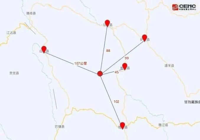 震中距新龙县45公里、距甘孜县88公里、距炉霍县99公里、距理塘县102公里、距白玉县107公里,距甘孜藏族自治州220公里,距成都市404公里。震中5公里范围内平均海拔约4251米。