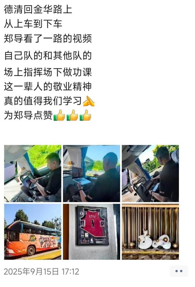 9月15日,金华队打完湖州队,也就是这波五连胜的第一场,金华队助理教练廖俭颖发布了这样一条朋友圈:“德清回金华路上,从上车到下车,郑导看了一路的视频,自己队的和其他队的,场上指挥,场下做功课,这一辈人的敬业精神,真的值得我们学习,为郑导点赞。”