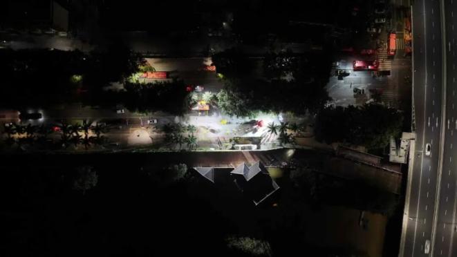 经过近6小时的连续奋战,截至10月9日6时30分,二坑泵站塌陷坑洞被加固填平,民生广场北大桥西侧坝体渗水情况得到有效控制。据统计,此次抢险累计抛填块石料450方、碎石料1000方,抛投机制沙袋6000余个。险情得到初步缓解后,队员们继续操作机械,向堤防底部抛填大块石料,增强堤防抗冲刷能力,同时对坝体内侧渗水点进行进一步加固,全面提升坝体稳定性。素材提供:谢敏、全浩宇、温志英