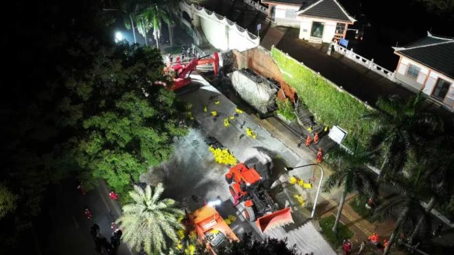 20时30分,抢险战斗正式打响。48名抢险队员分为3个作业组,各司其职、协同作战:一组操作挖掘机、装载机,将块石料、碎石料精准抛填至陷坑内,填充坑洞核心区域,阻断水流进一步冲刷;二组携带铁锹、编织袋,在坝体外侧堆砌机制沙袋,构建反滤层,防止渗水带走坝体土壤;三组则在坝体周边设立多个监测点位,测量水文变量、倒塌预警检测等,为有效安全救援打好基础。期间,倒塌预警监测组两次及时预警,现场作业人员安全撤离。