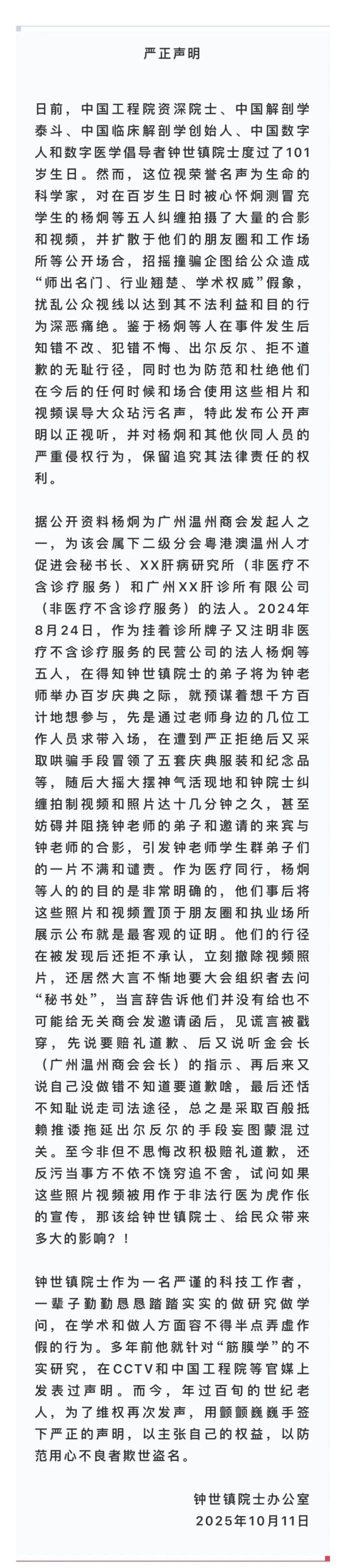 原标题:《101岁院士钟世镇发声明:寿宴上遭杨炯等5人冒充学生恶意纠缠,拍摄大量合影、视频扩散,企图造成“师出名门”假象以达商业目的》