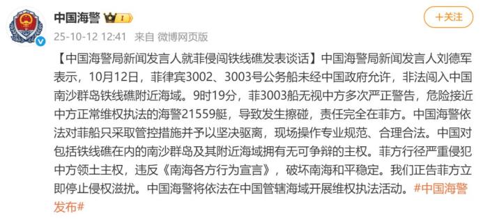 中国海警局新闻发言人刘德军表示,10月12日,菲律宾3002、3003号公务船未经中国政府允许,非法闯入中国南沙群岛铁线礁附近海域。9时19分,菲3003船无视中方多次严正警告,危险接近中方正常维权执法的海警21559艇,导致发生擦碰,责任完全在菲方。中国海警依法对菲船只采取管控措施并予以坚决驱离,现场操作专业规范、合理合法。中国对包括铁线礁在内的南沙群岛及其附近海域拥有无可争辩的主权。菲方行径严重侵犯中方领土主权,违反《南海各方行为宣言》,破坏南海和平稳定。我们正告菲方立即停止侵权滋扰。中国海警将依法在中国管辖海域开展维权执法活动。