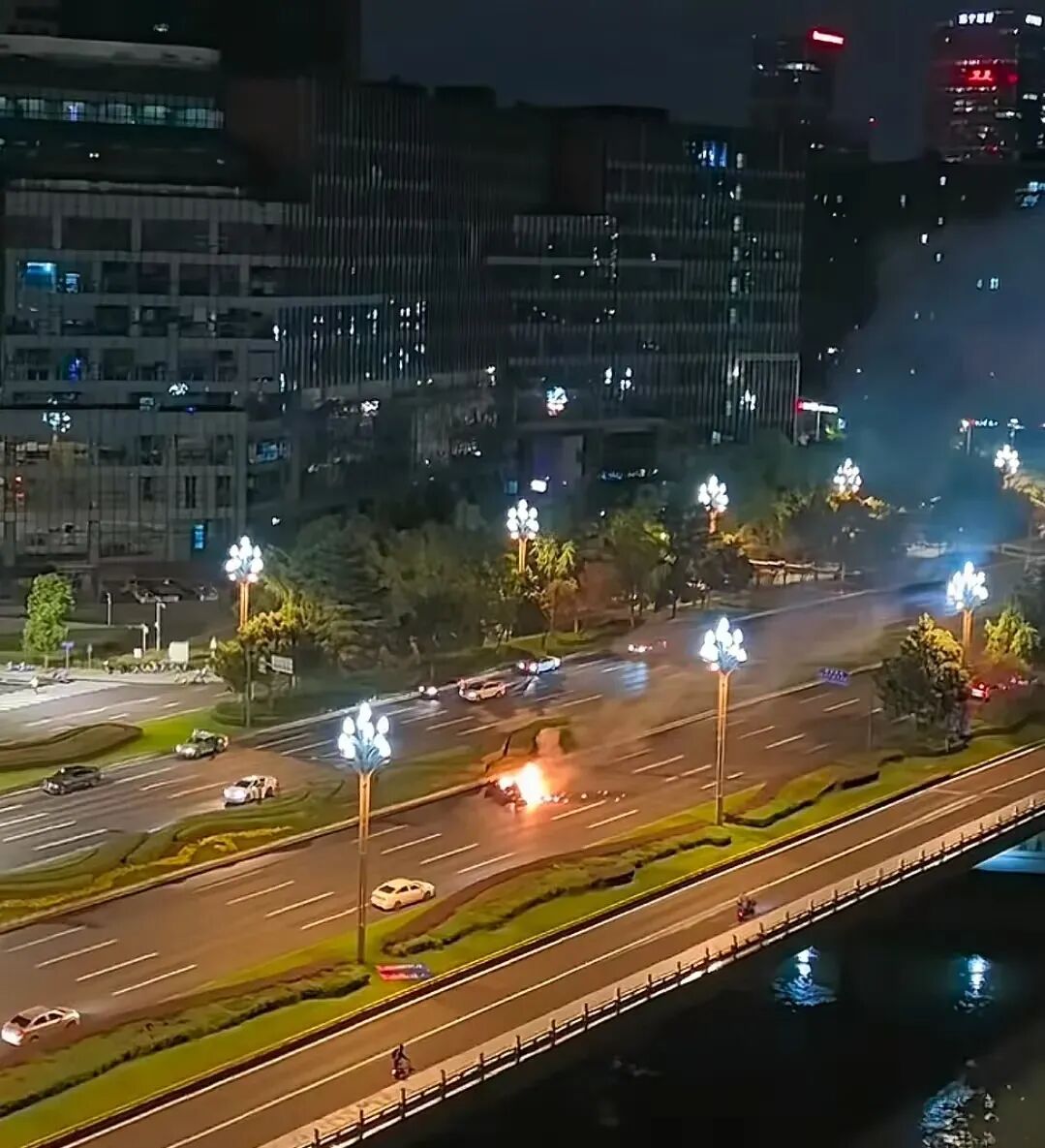 随后车辆超速失控,先与绿化带发生碰撞,随后翻滚至对向车道并起火。一名车主的行车记录仪显示,车辆碰撞前从右侧飞速驶过,碰撞后迅速燃起大火。