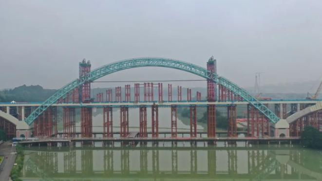 成渝中线高铁沱江特大桥位于简阳市石钟镇,全长1252.25米,主跨320米,建成后将创造世界最大跨度无推力组合拱桥纪录。