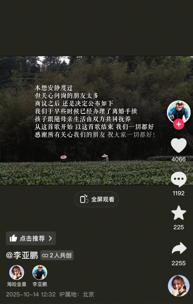 10月14日,李亚鹏和妻子海哈金喜共同发布视频,称两人已于早些时候办理了离婚手续,孩子跟随母亲生活,由双方抚养。