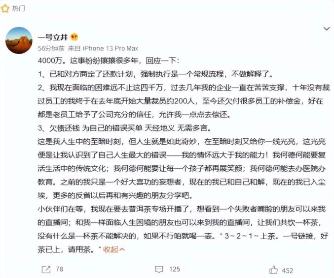 他还透露自己现在面临的困难远不止这四千万,去年底开始大量裁员约200人,至今还欠付很多员工的补偿金。李亚鹏还表示“欠债还钱,为自己的错误买单天经地义,无需多言”。