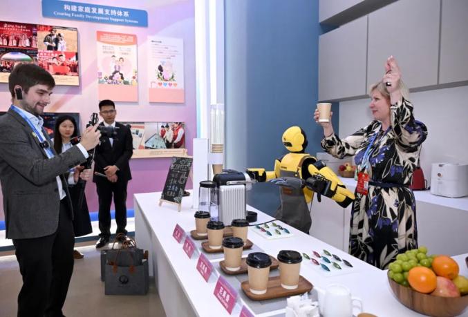 与会嘉宾体验智能机器人制作咖啡。当日上午,近百名中外嘉宾齐聚展厅,沉浸式体验数智赋能妇女和女童的丰硕成果,领略中国方案的温暖与效能,共同展望携手推动全球妇女事业迈向新台阶、让数字红利惠及更多妇女和女童的美好未来。