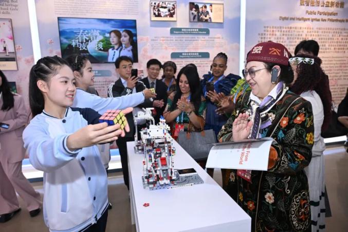 与会嘉宾与春蕾女童互动,体验机器人操作魔方。