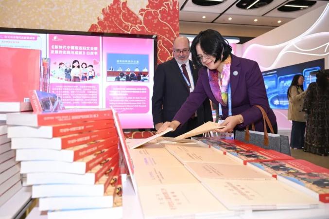 与会嘉宾在制度赋能展区翻阅书籍。来源/中国妇女报(ID:fnb198410)