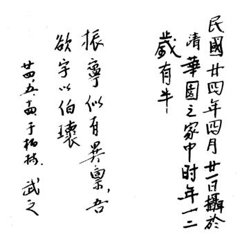 1935年于清华园西院11号杨家院中。远在柏林念子心切的杨武之在照片背后写下:振宁似有异禀,吾欲字以伯瓌。