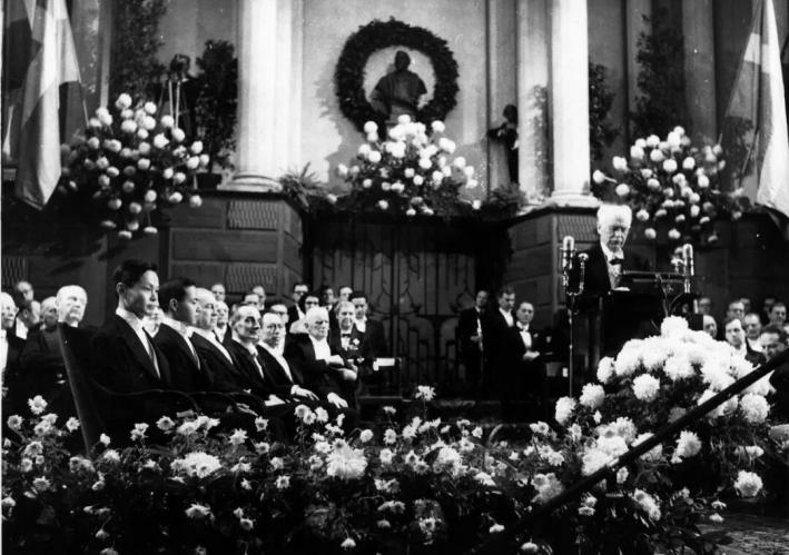 1957年诺贝尔奖颁奖现场。左起第一为杨振宁,第二为李政道。