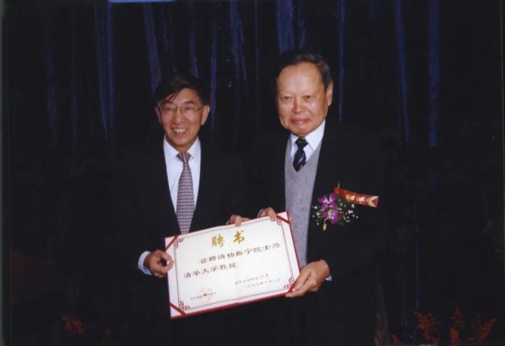 杨振宁(右)从时任清华校长王大中(左)手中接过清华大学聘书